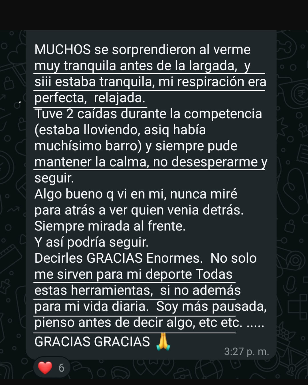 Mi hija anoche terminó la sesión feliz, ella es un poco tímida pero se le notaba en la cara lo cómoda que estaba escuchándote, gracias por llegar y poner tu granito de arena a todos estos deportistas que tienes la magia de tocar.